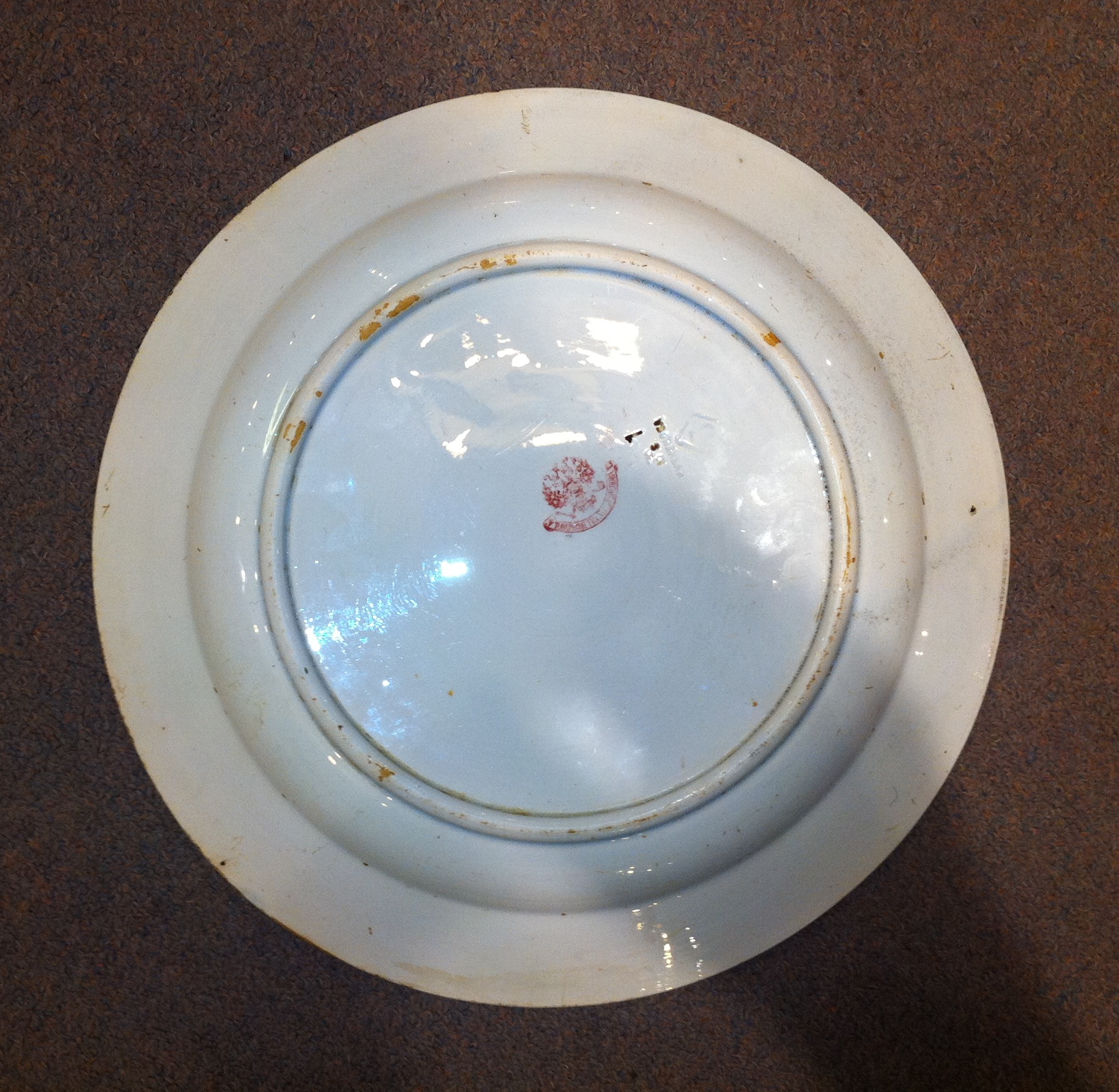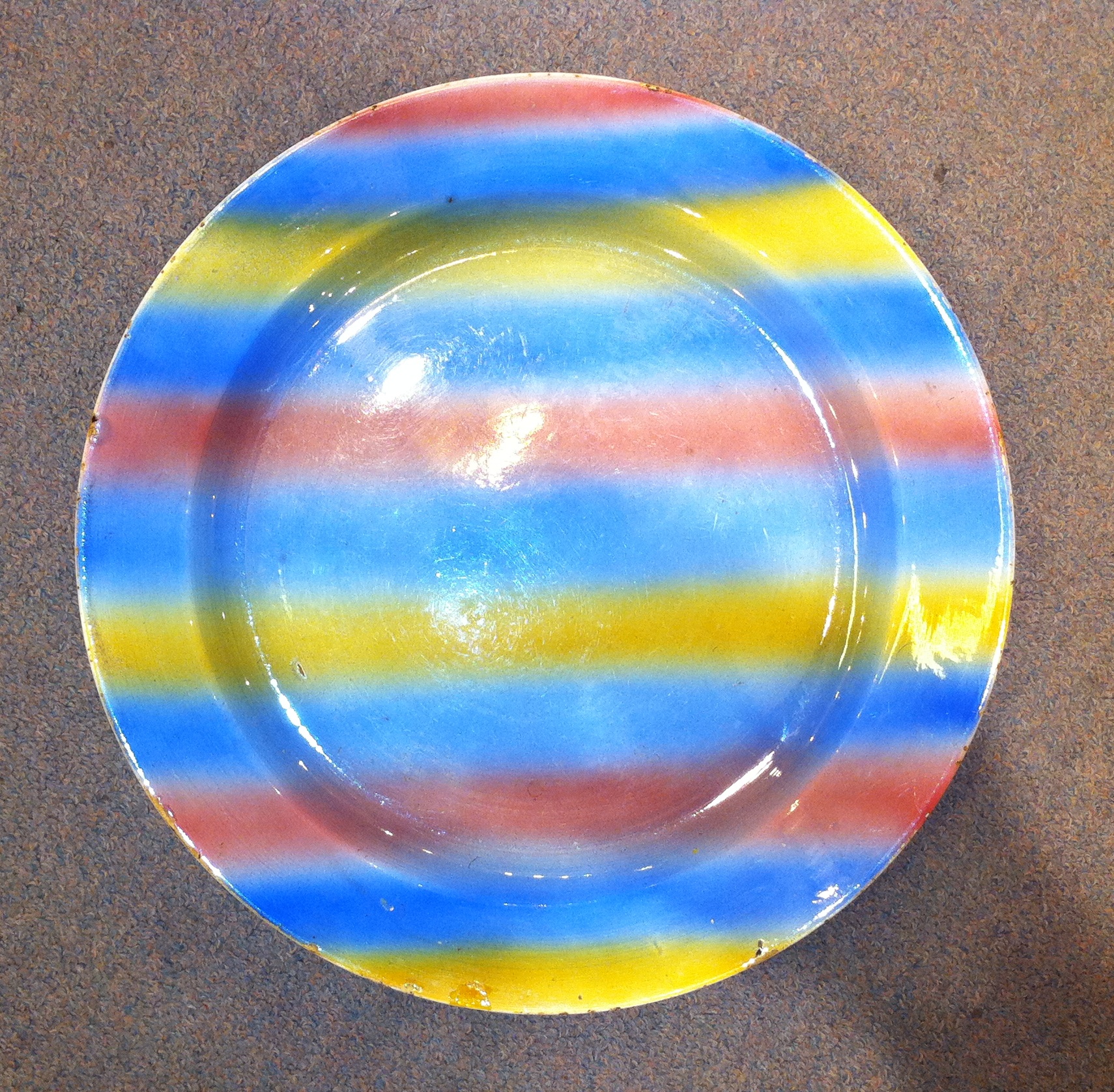 Originally made for the Emir of Bukhara by the Kuznetsov Porcelain Factory in Russia, the centre and rim with blue, yellow and pink stripes