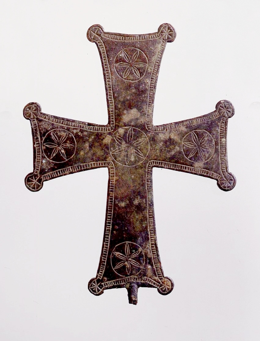 Of the patée type on account of the small discs (paws) at the corners of its flaring arms, the cross is made of cast brass and engraved with roundels containing six-petalled flowers. Ornaments of this type are commonly found in early Christian silverware and architectural decoration. At the base, the remaining part of a small flange, or tang, indicates that this small cross was probably once fixed to a handle as a portable item of personal devotion.