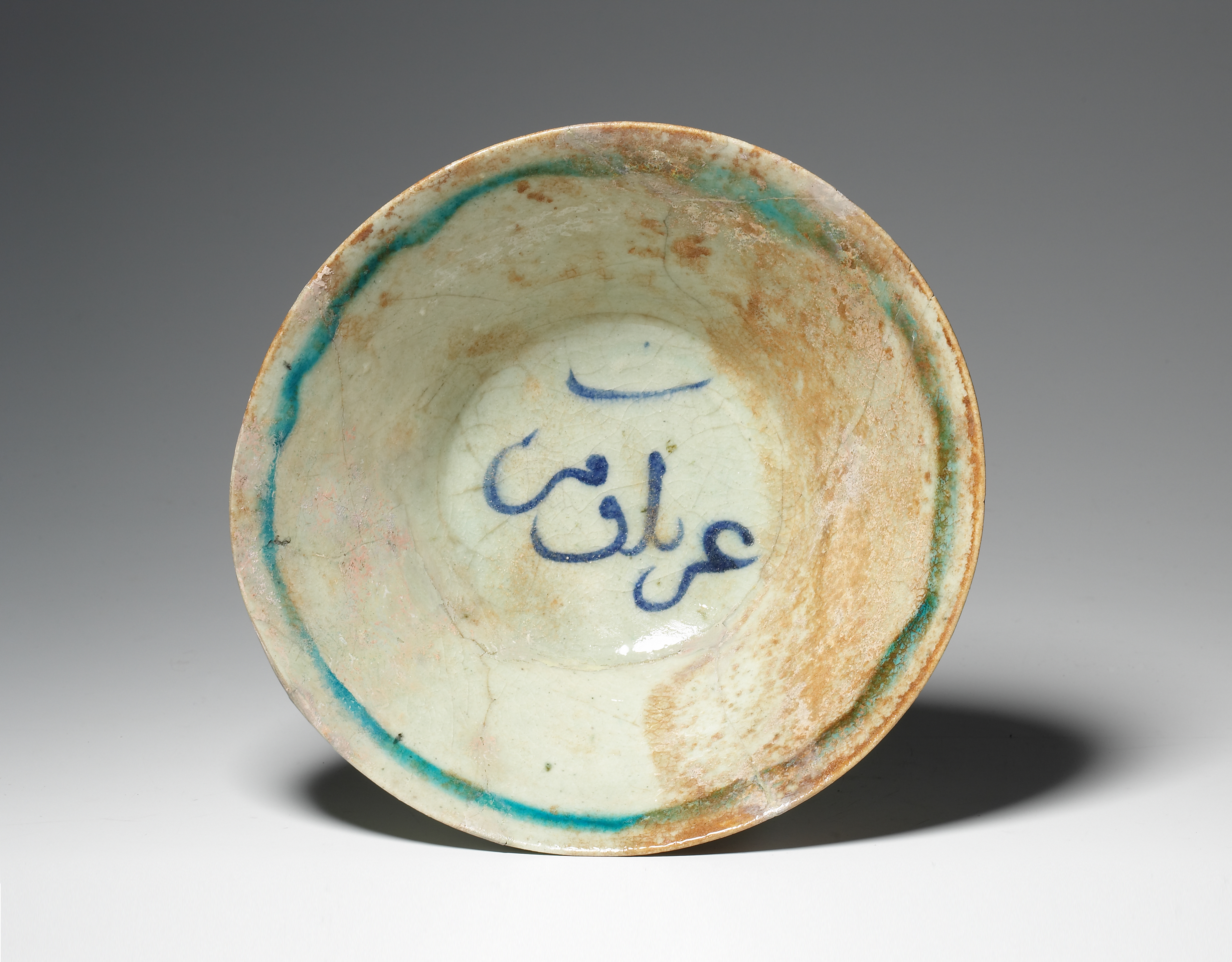 On a high cylindrical foot, the slip-painted white interior is decorated with a central cursive inscription in cobalt blue which reads, "May Glory be everlasting", around the rim, a meandering turquoise band. Repaired breaks; areas of light silvery iridescence.