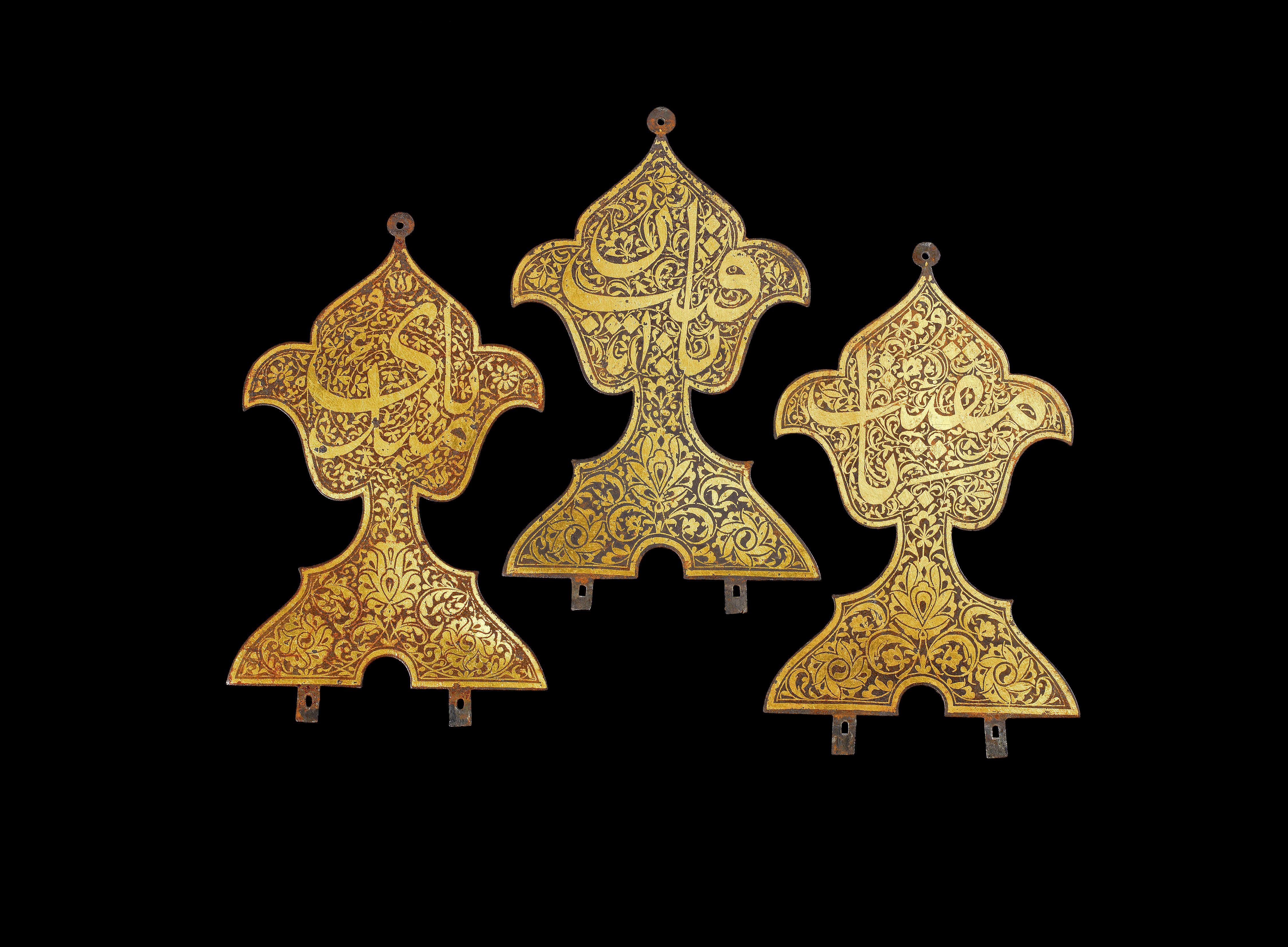 Each in the form of a trefoil with two attachment fittings on the bottom edge. Each inscribed with a name of God in Thuluth script against a scrolling floral vine; the lower section with a lotus flower and spinning blossoms among serrated saz leaves.