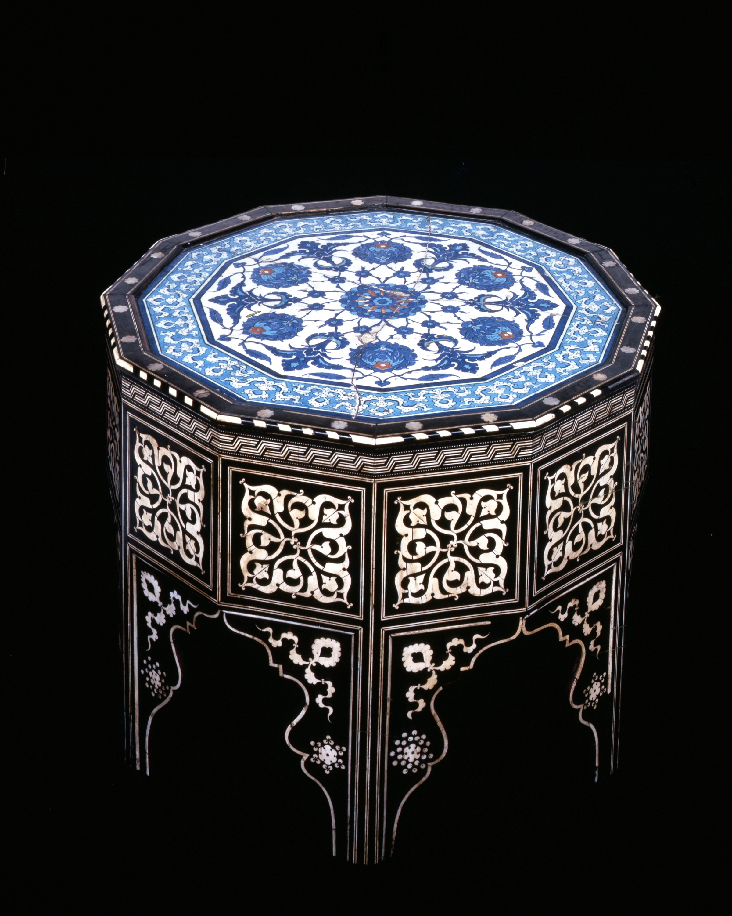 Once in the collection of Farouk, the last king of Egypt, this table harks from the most glorious period of Ottoman art, the reign of Suleiman the Magnificent. The construction of the base is of softwood faced with a veneer of ebony with marquetry of ivory and mother of pearl. It is the product of a court workshop in Istanbul, made to order to accommodate an unusually large, 12-sided, tile from Iznik as a table top. The decoration of the woodwork and the tile are both consistent with the courtly style current during the last phase phase of Suleiman’s long reign at around 1560.