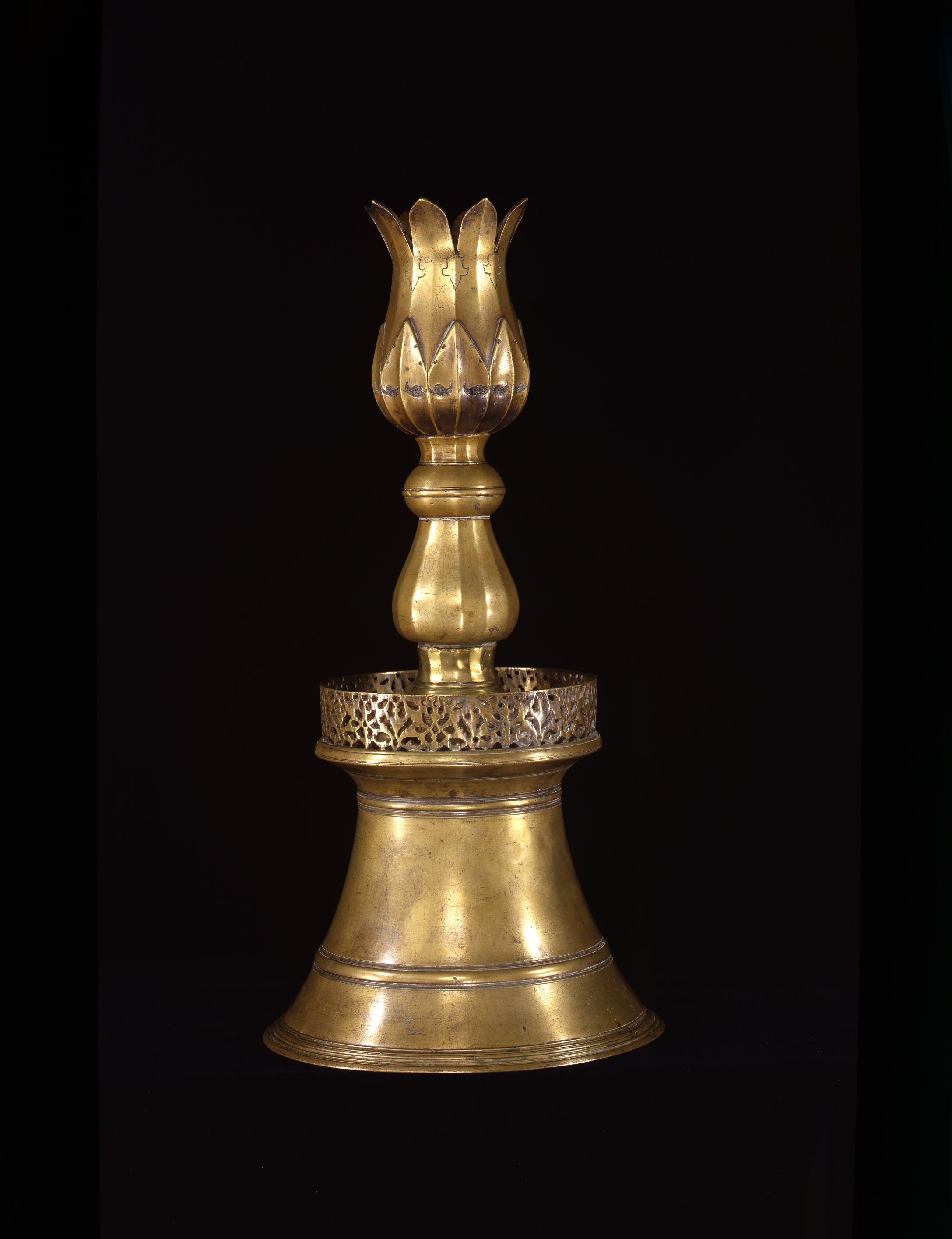 Cast in brass in three pieces and turned, the flaring shoulder of the bell-shaped base is surmounted by an openwork parapet pierced with a pattern of rumi arabesques. The bulbous baluster shaft is delicately faceted and terminates in a flaring candleholder fashioned like a blossoming tulip with two layers of petals. The lower layer is ribbed and chased with paired leaves inlaid with niello; in the tulip's upper layer, the petals are faceted and at the point they separate to flare outwards, they are delicately engraved with downwards-pointing trefoils.