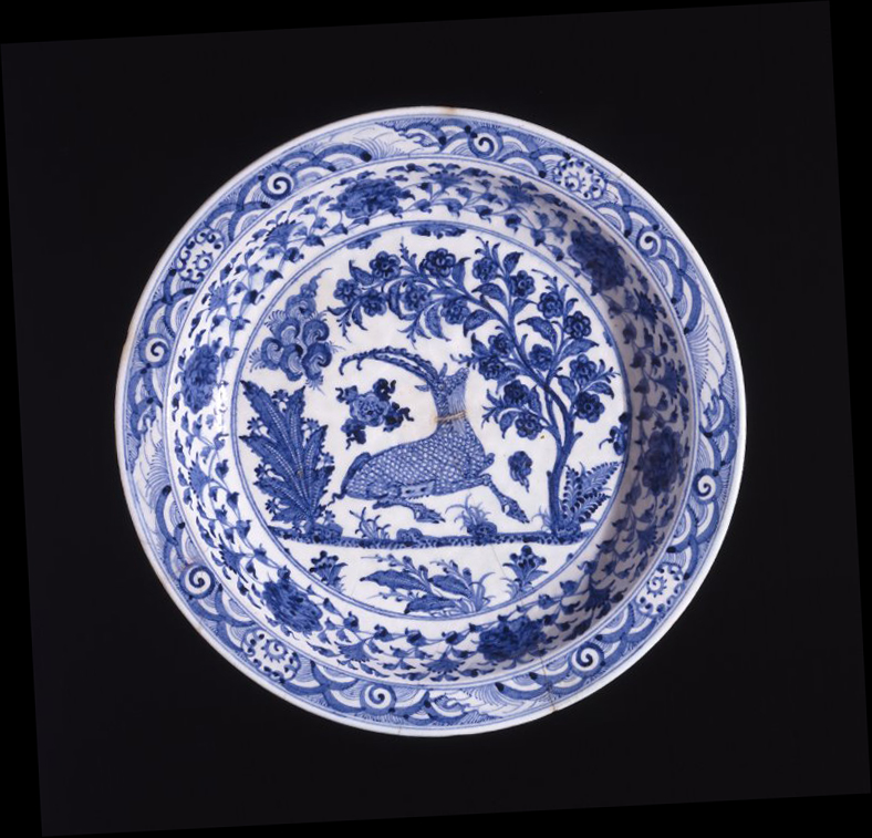 At the centre of a verdant landscape, a reclining ibex is craning its neck to pick leaves from an overhanging tree laden with fruit, an imagery symbolic of abundance and fertility in nature. The cresting wave border on the flat rim and the scrolling band of lotus blossoms in the cavetto are directly derived from early Ming blue & white porcelains and testify to the strong influence these wares exerted on Iranian potters a hundred or so years later.