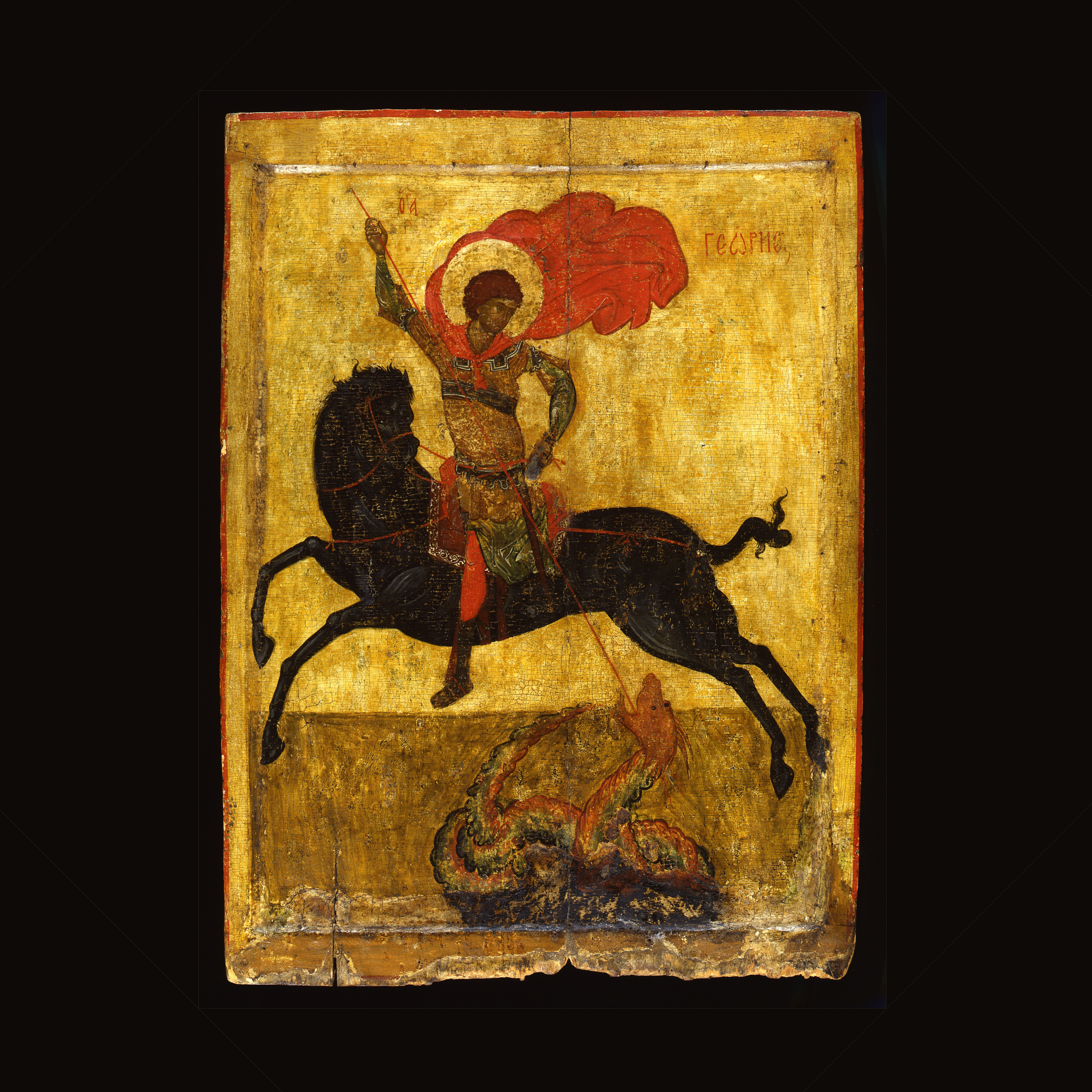 In these, George is almost invariably shown mounted on a white charger, and it is his unusual representation here on black horse which has given this famous icon its name. One of the earliest renderings of the Miracle of St George and the Dragon on panel painting in Russia, its place of origin has been variously attributed to Pskov or Novgorod in the Russian North, sometime between the late 14th and the middle of the 15th century. In both composition and detail, however, the icon demonstrates the strong influence of Palaiologan art across the Orthodox world.